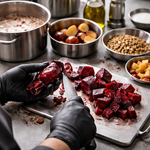 Nagrzej piekarnik do 200°C (góra-dół). Umyj buraki szczoteczką, osusz papierowym ręcznikiem. Obetnij korzenie i liście (można zostawić 1–2 cm szypułkę). Jabłka umyj, przekrój na pół i usuń gniazda nasienne (nie obieraj, jeśli skórka ładna — nada smaku; jeśli skóra twarda, obierz). Suszone śliwki przepłucz pod ciepłą wodą.
