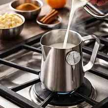 W osobnym wysokim naczyniu (dzbanku do spieniania lub wysokim kubku) podgrzej 100 ml mleka z odrobiną cynamonu (1/2 łyżeczki = 1 g), podgrzewaj do ciepła (60–65°C). Użyj spieniacza ręcznego, elektrycznego lub trzepaczki typu molin (French whisk) i ubij mleko energicznie przez 20–40 sekund, aż powstanie gęsta, trwała pianka. Jeśli nie masz spieniacza, możesz przelać ciepłe mleko do słoika, zakręcić i energicznie wstrząsać przez 30–60 sekund, a następnie zdjąć pokrywkę i postawić na chwilę, by piana się ustabilizowała.