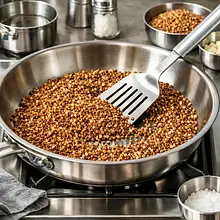 Użyj szerokiej patelni (średnica min. 24 cm). Prażenie rozwija smak — pilnuj, bo łatwo przypalić; jeśli czujesz dym, zmniejsz ogień natychmiast.